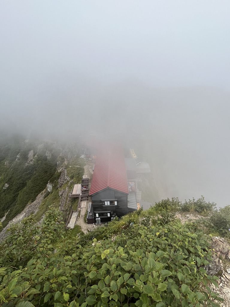 10時45分、キレット小屋に到着。少しの安堵感とともに、振り返ると自分が通ってきた道が遠くに見えた。その瞬間、「僕はここを超えたんだ」と確信し、克服の喜びが心に満ちた。