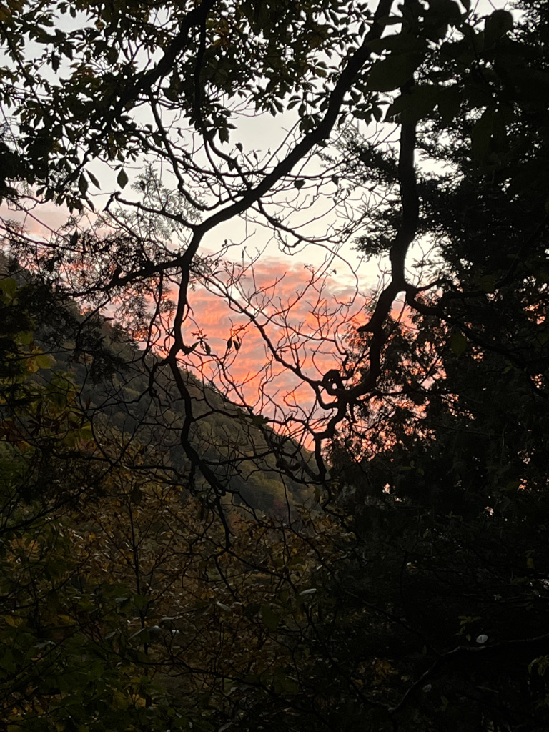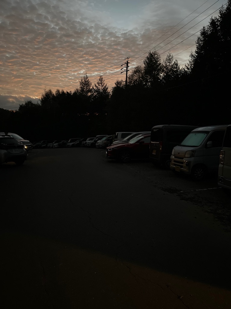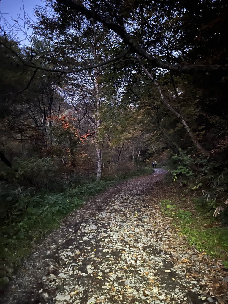 10月16日の早朝3時、三股登山口の第一駐車場に車を停めた。すでに8割方埋まっていたが、何とかスペースを確保できた。登山を開始したのは午前5時半、ヘッドライトを点けてのスタートだった。最初は樹林帯をひたすら登る急坂が続く。ここで早くも心が折れそうになったが、木々の間から蝶ヶ岳や稜線が見え始めると、少しずつ気分が持ち直してきた。