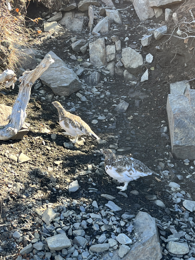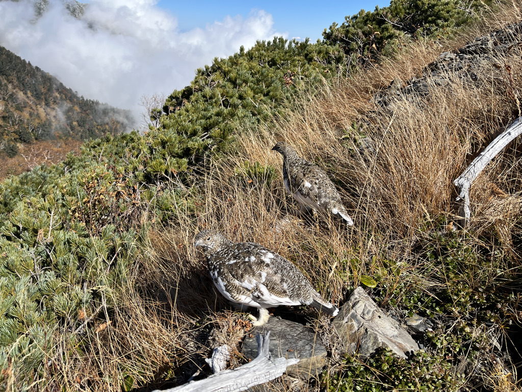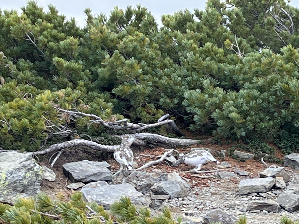 蝶ヶ岳ヒュッテに着いたのは昼過ぎだった。ここではカレーライスとおでんを食べた。山小屋で温かい食事を取るのはこれが初めてだったが、その美味しさは格別だった。ヒュッテのそばにある蝶ヶ岳のピークまで足を伸ばし、ここでも再びライチョウに出会った。蝶ヶ岳近辺のライチョウたちは、私を歓迎してくれているかのようだった。