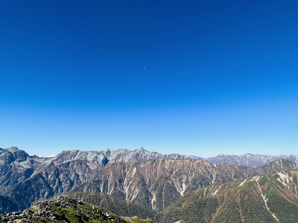 常念岳の山頂からは、槍ヶ岳や穂高連峰が間近に見えた。この日、空は快晴で、遠くには富士山も確認できた。さらに、驚いたことに、槍ヶ岳の上空にお月様が浮かんでいた。日中に見える月とアルプスのパノラマが織りなす景色は、まるで絵画のように幻想的だった。これがパノラマ銀座か、と心の底から納得した瞬間だった。