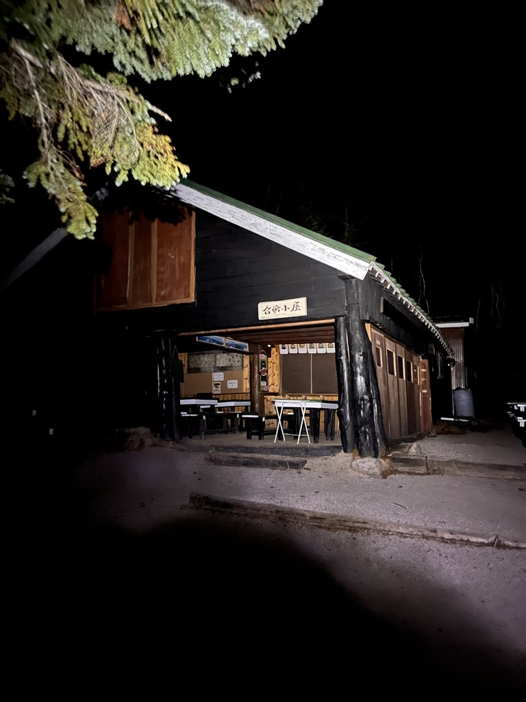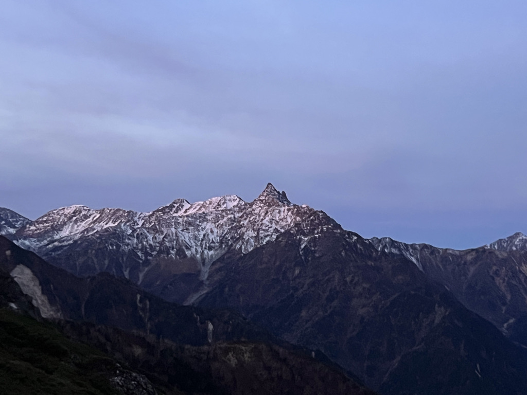 ナイトハイクはこれが初めてではない。それでも暗闇の中を歩くときの独特の緊張感には慣れないものがある。静まり返った登山道で一人きりという状況は、どれだけ経験を積んでも心の奥をざわつかせる。それでも順調に歩を進め、5時半には燕山荘に到着した。山荘の前から見た槍ヶ岳は、近い。これまでいくつもの山から槍を眺めてきたが、ここからの槍はその存在感がまるで違う。雪をまとったその姿は、まるで孤高の剣士のようで美しかった。