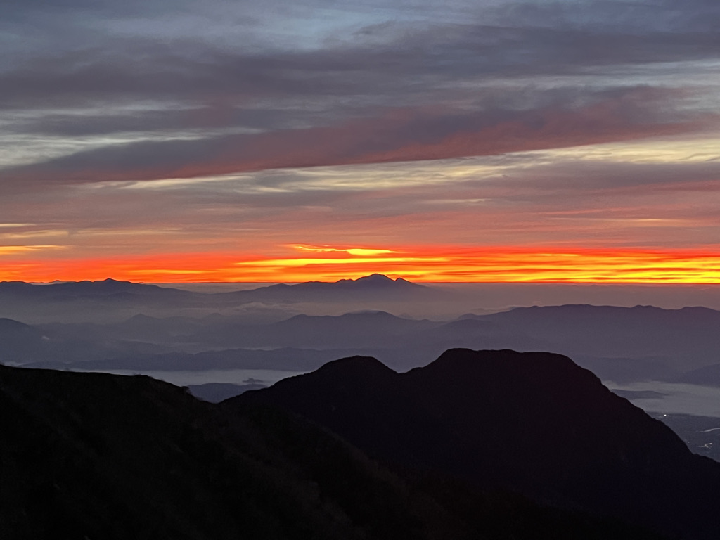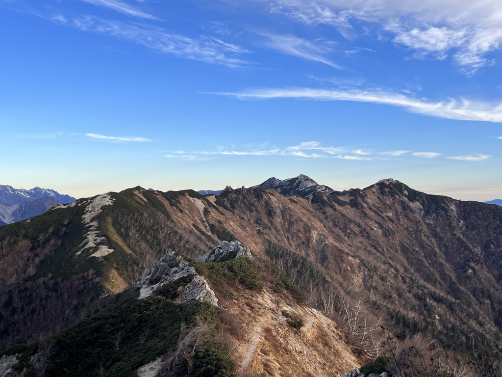 燕岳のピークはすぐ近くだったが、僕は進路を大天井岳に向けた。目指すべきはそこだ。表銀座コースをたどりながら、右手には北アルプスの山々、左手には朝焼けが広がる稜線を歩いた。冷たい風が頬を叩き、途中でバラクラバを取り出して着用した。寒さは確かに厳しいが、その分、稜線上の空気は澄んでいて気持ちよかった。