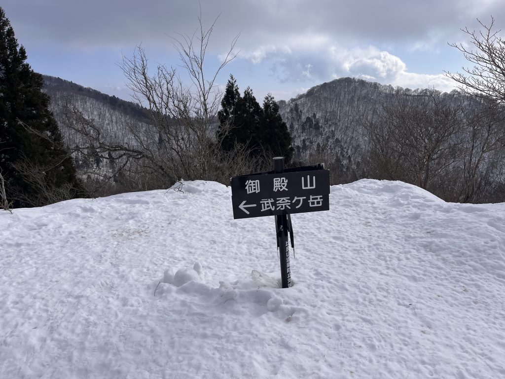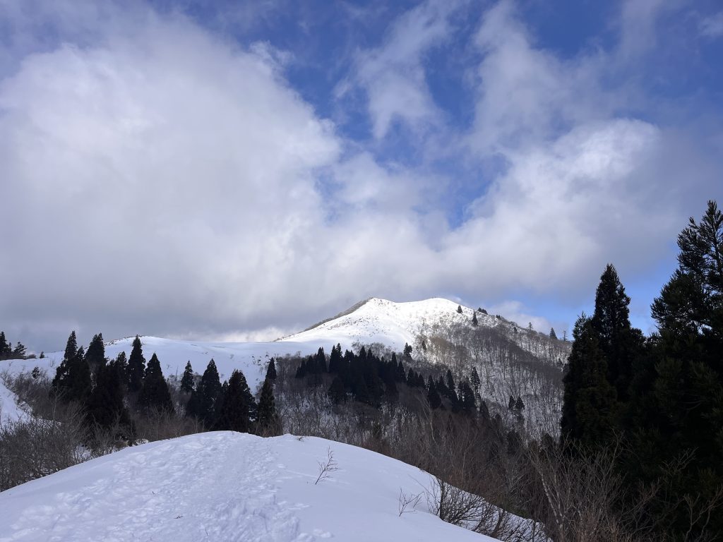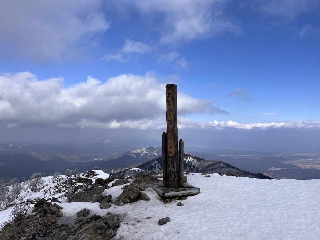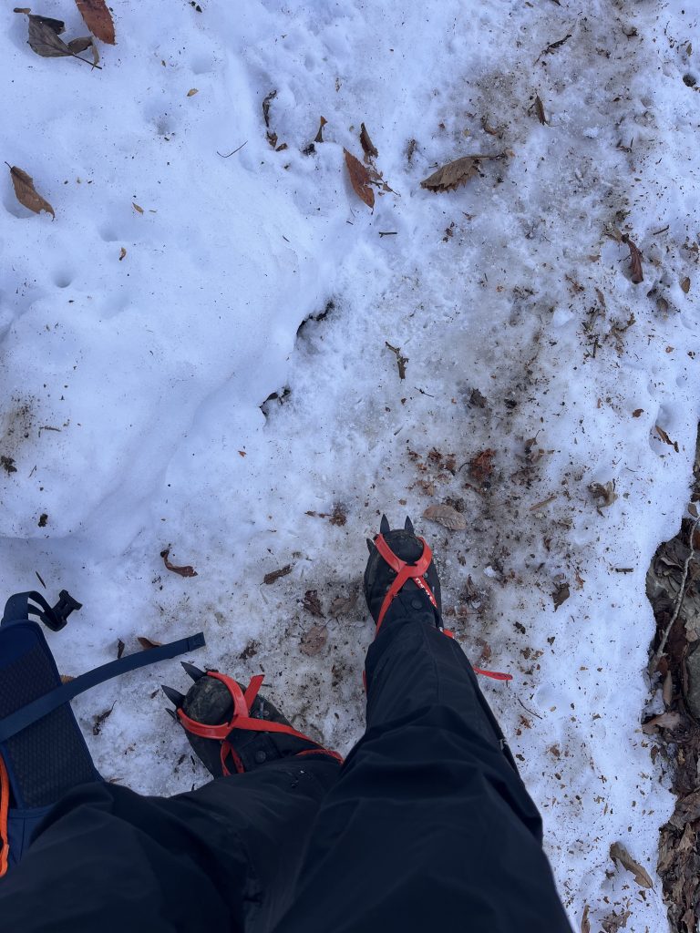 朝9時、駐車場に車を止め、装備を整える。久々の雪山登山に、少し緊張感と高揚感が混じる。冬装備で歩き始めると、すぐに体が暑くなった。冬山の里山ではいつものことなのに、忘れていた。アウターを脱ぎ、薄着で進む。標高630m付近でちらほらと雪が現れ始め、690mでは登山道が凍結していた。アイゼンを装着し、雪と氷を踏む音が耳に届く。ザク、ザク、ザク、ザク。この音が心地良すぎて、気づけば無意識に足音を楽しんでいた。不思議なもので、雪山を歩くと頭の中が整理されていくような気がする。今回、その感覚を思い出し、心から心地よさを感じた。