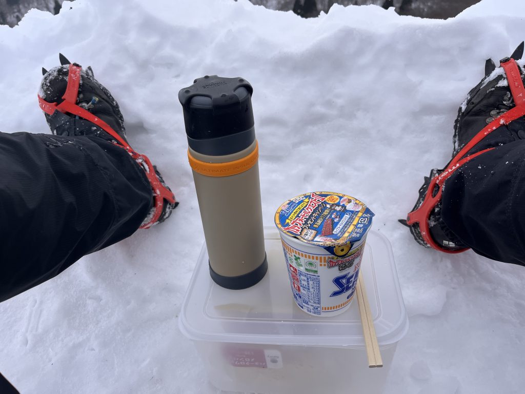 御殿山に到着する頃には風が冷たくなり、アウターを再び着る。そしてそのまま山頂へ。武奈ヶ岳の山頂は静かで、周囲を雪に包まれた冬山らしい景色が広がっていた。ここで、サーモスに入れてきたお湯を使い、カップラーメンとコーヒーを楽しむ。雪山で温かい食事と飲み物は何よりの贅沢だ。身体が芯から温まり、疲れもどこかへ消えていくようだった。
