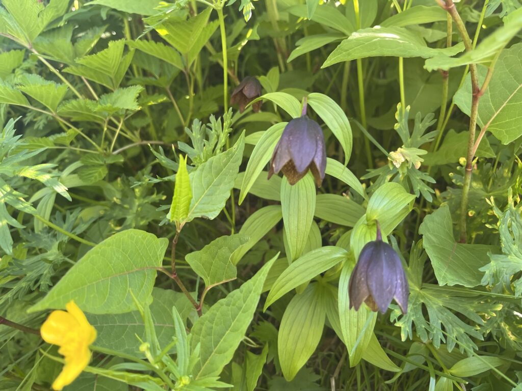 登り始めてすぐ、日陰の草むらにうつむくように咲くクロユリを見つけた。