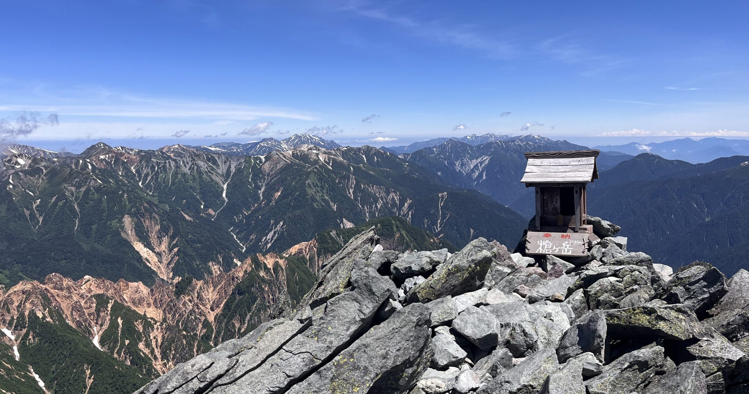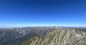 今回はヘルメットをしっかり持ってきた。初めて槍ヶ岳に登った後、さらに色々な山に挑戦したくなって購入したものだ。穂先に近づくにつれ、そのヘルメットを装着し、頭の中も気持ちを引き締めた。前回と同じはずの風景が、一層澄んで広がっている気がした。穂先に立ったとき、そこには僕以外に数人の登山者がいたが、やがて彼らが去っていくと、穂先を独り占めできる時間が訪れた。空は晴れわたり、山々が青のグラデーションに染まっていた。