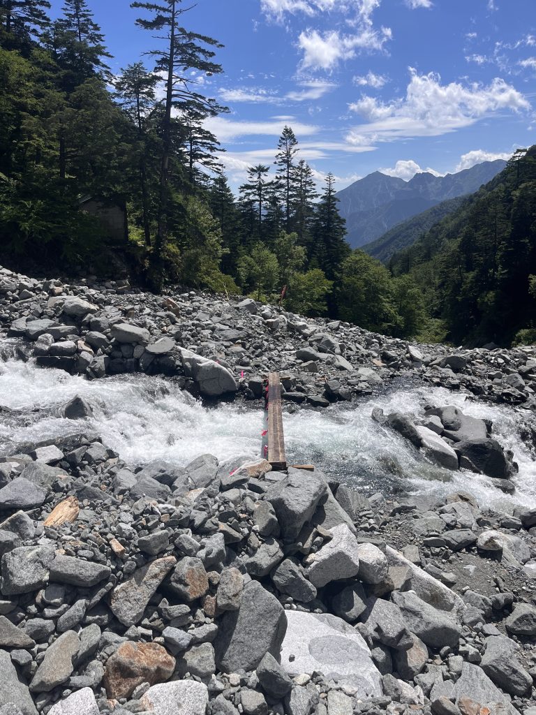 前回と同じ道のはずだが、不思議なことに、すべてが少し違って見える。川沿いにかかっているはずの木の橋がない。7月11日から槍平小屋が営業するのに合わせて、橋を設置する準備が進められていたようだ。行きでは橋がない川を見つめながら、飛び越えられそうな場所を探して、慎重に飛んだ。着地でバランスを崩したが、僕は深い息をついて笑った。こんな小さな出来事でさえ、前回にはない経験として心に刻まれる。