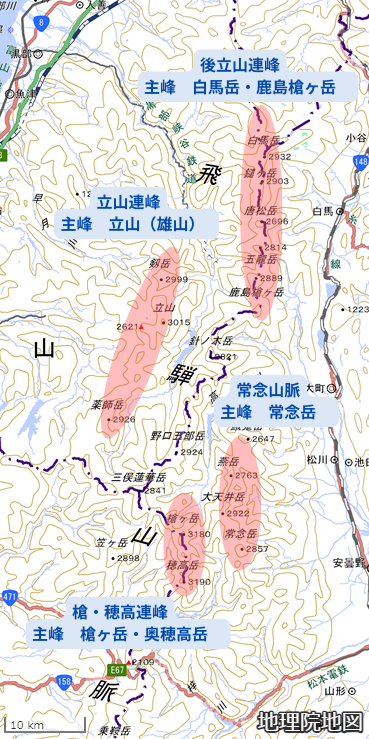 地図で見る北アルプスの主要エリアと主峰